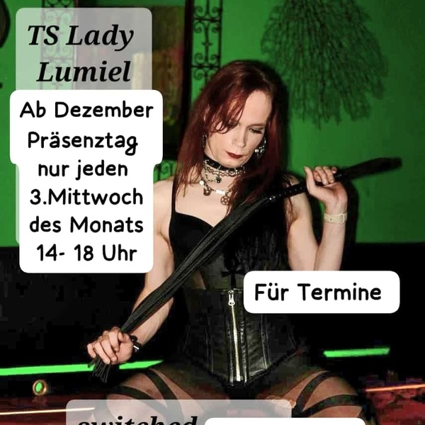TS-Lady Lumiel wird nicht mehr jeden Freitag im Hause sein sondern nur auf Termin, den man über ihr Handy vereinbaren kann mit ihr.: 0178-1272084, Präsenztag nur noch der 3. Mittwoch des Monats 14-18 Uhr.